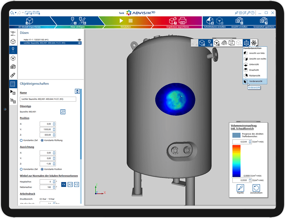 Ob statische, dynamische oder rotierende Düsen das Fluid mit dem richtigen Volumen, dem erforderlichen Druck und im richtigen Winkel an den gewünschten Punkt bringen sollen – ADVISIM3D ist Ihr digitaler Assistent für die virtuelle Simulation fast aller düsen- und flüssigkeitsbasierten Reinigungskonstellationen.